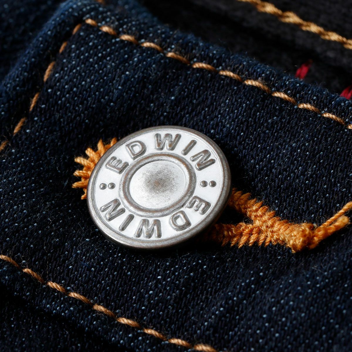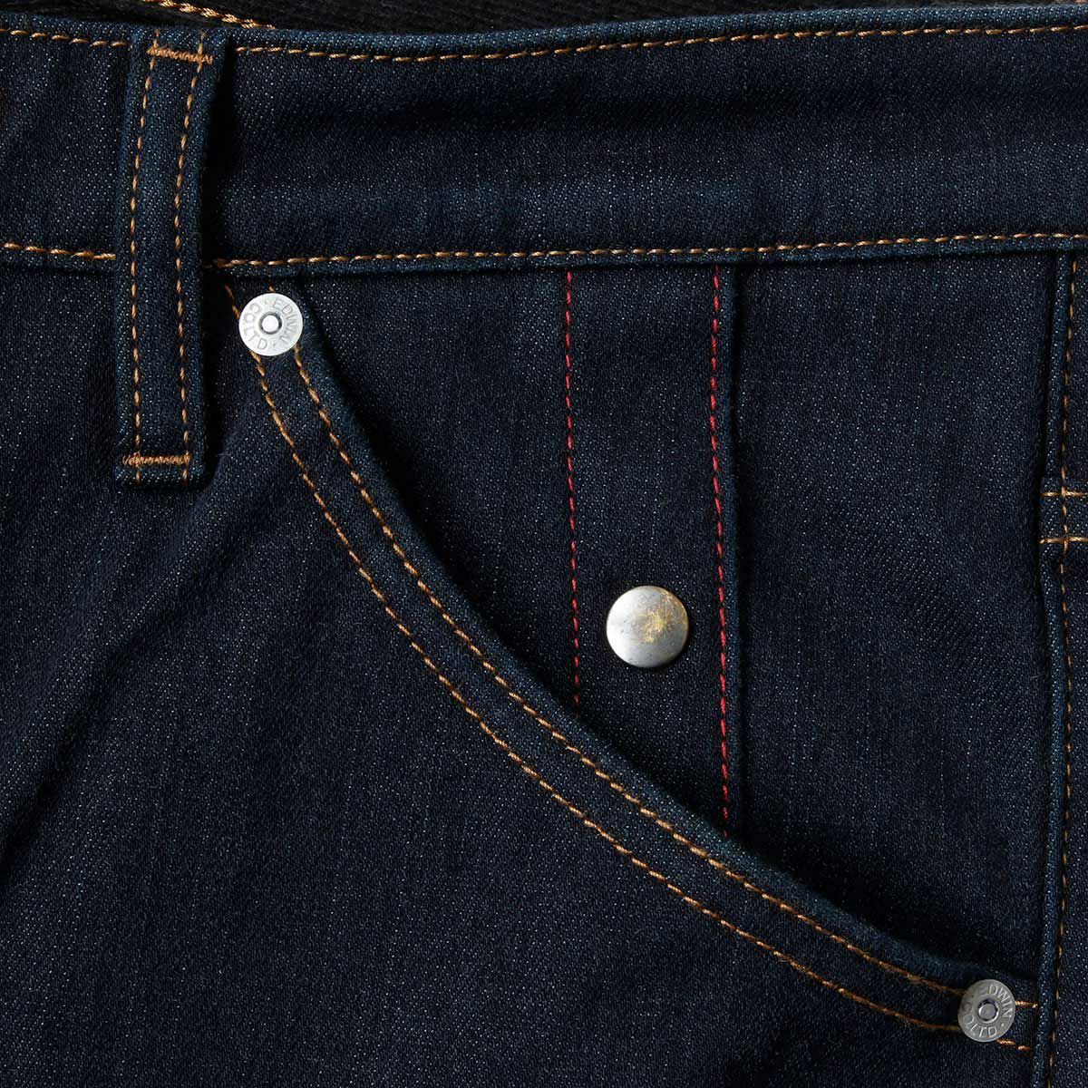 トップボタン、フラットリベット、オリジナルレザーパッチ。エドウィンが手掛けるデニムと同等以上のこだわりあるパーツ仕様により、ライディングウェアとして、普段着としても着用できる汎用性の高い1本に仕上げることを可能にしています。